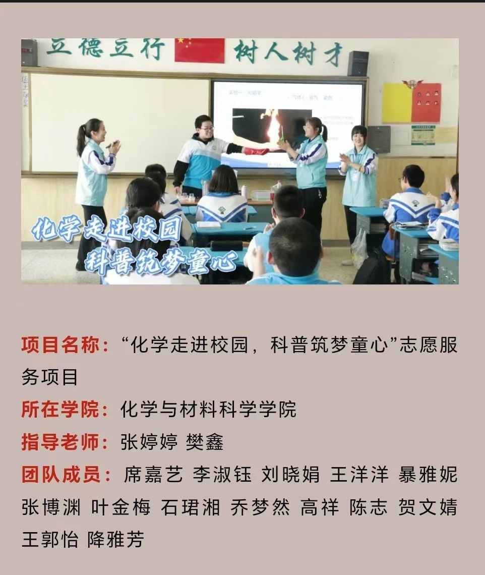 “化学走进校园”科普活动已连续举办六年,依托77779193永利集团专业资源优势,以“服务基础教育、提升科学素质”为宗旨,积极构建社会实践和志愿服务育人体系,厚植大学生的家国情怀,努力为中小学基础教育开展专业化科普。