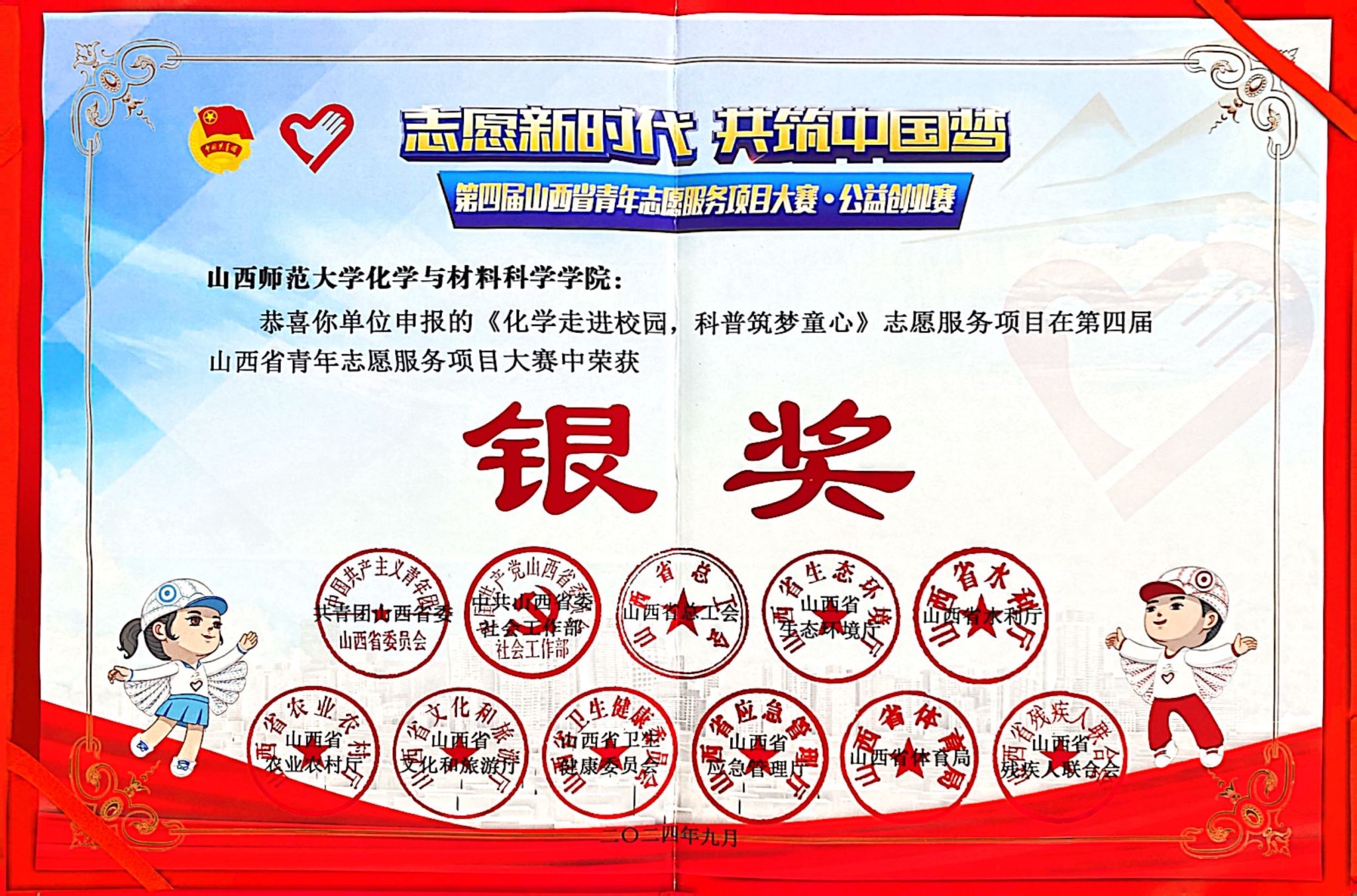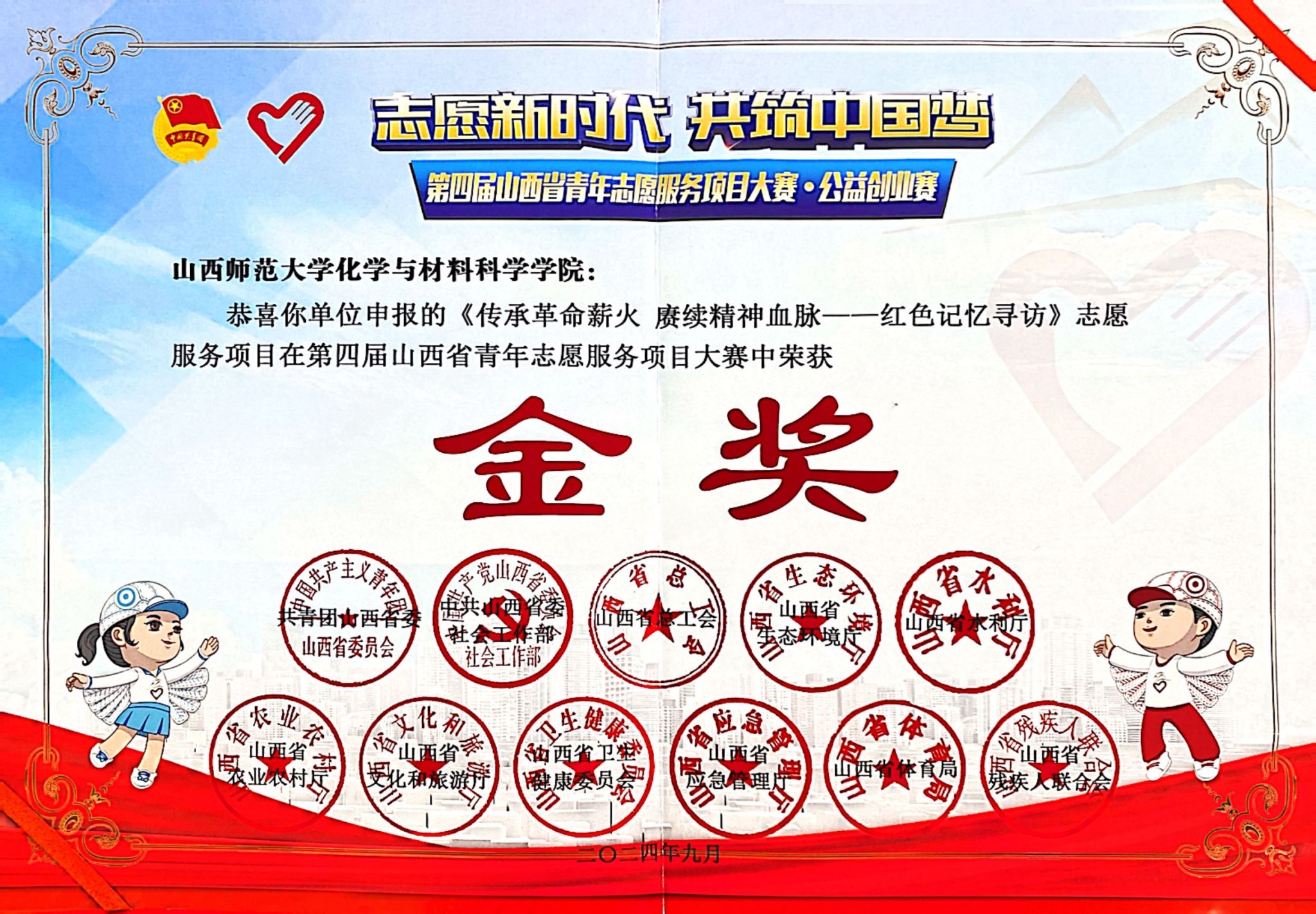 9月10日,第四届山西省青年志愿服务项目大赛和公益创业赛落下帷幕,77779193永利集团《传承革命薪火 赓续精神血脉——红色记忆寻访志愿服务项目》和《“化学走进校园,科普筑梦童心”志愿服务项目》从省决赛中脱颖而出,分别获得省级金银奖,并被推报国赛。