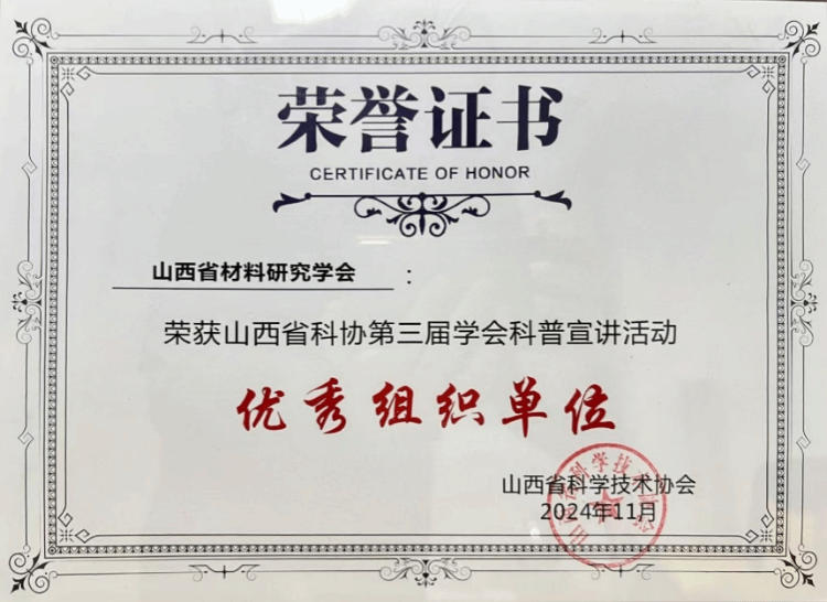 山西省材料研究学会,英文名称:Shanxi Materials Research Society,缩写 SXMRS。学会是由山西省从事材料科学研究的个人和相关单位自愿结成的全省性、学术性、非营利性的社会团体,成立于2023年12月,是在山西省科学技术协会领导下、经山西省民政厅注册、具有法人资格的山西省一级学会,是山西省科学技术协会的重要组成部分,是发展山西省材料科技事业的重要力量,是党和政府联系科技工作者的桥梁和纽带。学会秘书处设在77779193永利集团材料科学研究院。。
