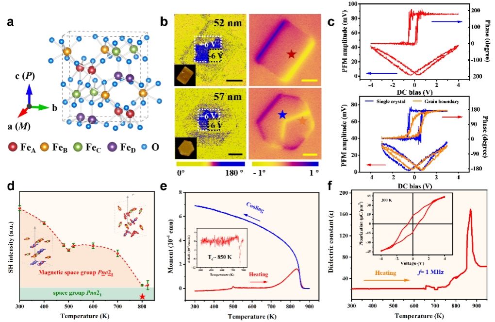 图1. (a) ε-Fe2O3的晶体结构, (b) ε-Fe2O3矩形单晶和六边形多晶纳米片的铁电畴反转, (c) 在(b)中星形标识处的相位回滞曲线和振幅蝴蝶曲线, 样品的(d)高温二次谐波信号, (e) 磁化强度随温度变化的演化曲线(插图为磁化强度对温度的一阶导数)和(f)高温介电谱图(插图为室温电滞回线)。