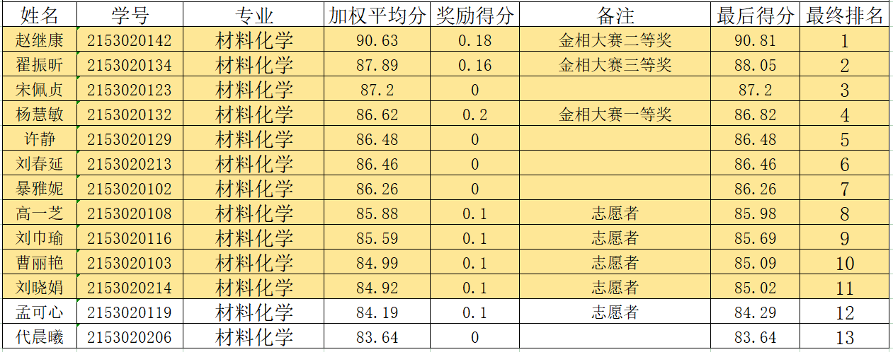 2025年材料化学专业推免生遴选结果: