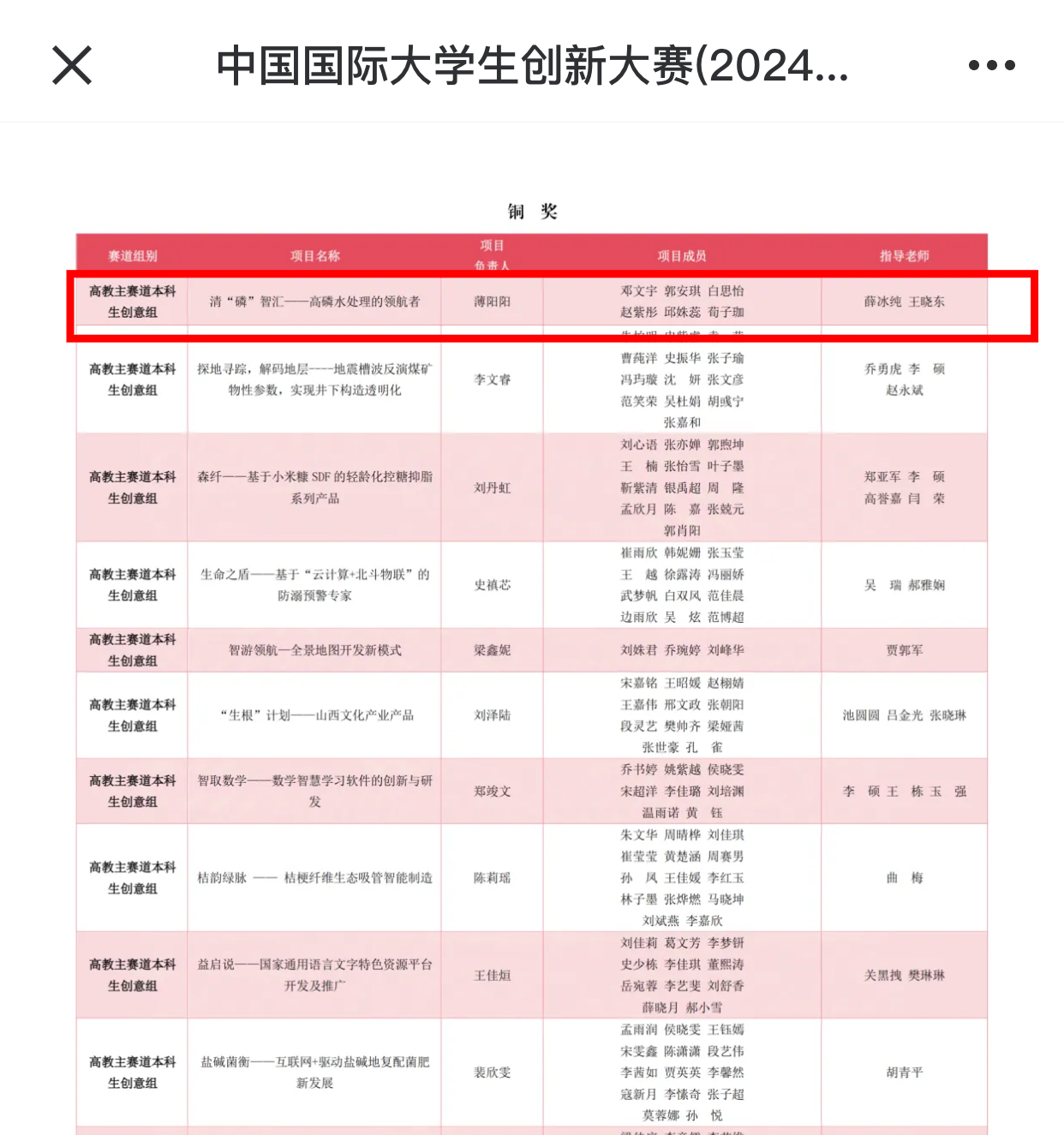 近日,省教育厅公布了中国国际大学生创新大赛(2024)山西赛区比赛获奖名单。经过层层选拔,永利集团官网学子薄阳阳、邓文宇、郭安琪、白思怡、赵紫彤、邱姝蕊、荀子珈团队作品“清‘磷’智汇——高磷水处理的领航者”(指导教师:薛冰纯、王晓东)荣获铜奖!