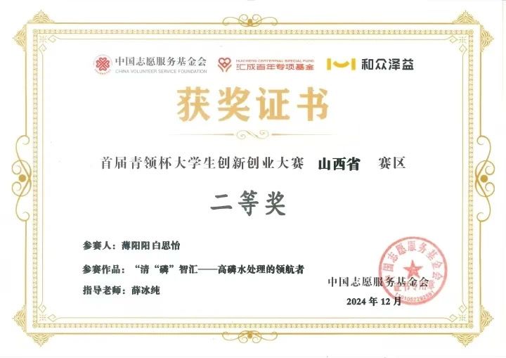12月1日,首届“青领杯”大学生创新创业大赛山西省赛区总决赛在太原理工大学圆满落幕。永利集团官网学子团队作品“清‘磷’智汇——高磷水处理的领航者”从众多具有创新性和市场潜力的优秀作品中脱颖而出,斩获二等奖!