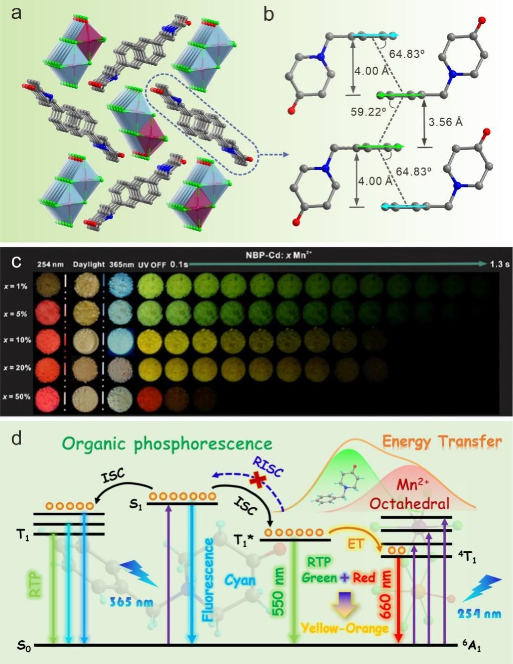 近期,永利集团官网张献明教授研究团队成功报道了新型杂化金属卤化物室温磷光材料[(NBP)Cd2Cl5H2O]。该材料展现出蓝白色荧光发射,以及持续2秒的黄绿色磷光发射。随着Mn2+掺杂含量逐步增加,磷光发射颜色从黄绿色(1%-5%)依次变为黄色(10%)、橙色(20%),直至红色(50%),且余辉时间逐渐缩短。光谱分析与理论计算研究表明,这一动态多色余辉的发射机制源于有机阳离子中的三重态激子向Mn2+的d轨道能级的能量传递过程。此外,该材料在防伪和信息加密领域也展现出巨大应用潜力。