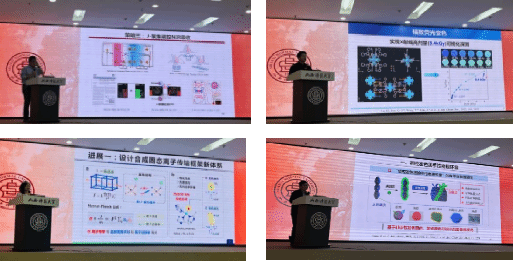 讲座伊始,刘志鹏教授先以“近红外吸收型氟硼配合物的构建”为核心展开分享。他以经典的BODIPY染料为研究对象,凭借多样化策略精准调控光物理性能,研发了一系列近红外吸收型新材料。林键教授围绕“辐射剂量和关键核素可视化探测研究”主题进行深入报告。特别强调了核辐射检测对核应急能力和核安全的重要性,其团队通过开发先进可视化探测技术成功实现辐射剂量及关键核素分布的实时监测与精准分析。接着,黄文欢教授聚焦“杂化氮唑离子传输框架”,从设计合成固态离子传输框架新体系等三个方面进行讲述。其课题组通过调控氮唑配体构建了一系列具有高离子传导率和优异稳定性的杂化框架材料,为电池等领域应用提供了可靠保障。最后,段鹏飞老师带来“多层次手性纳米体系的圆偏振发光及功能”的讲座。详细阐述了高发光不对称因子的新型材料的可控构筑,并点明此类材料在众多领域的广阔应用前景。